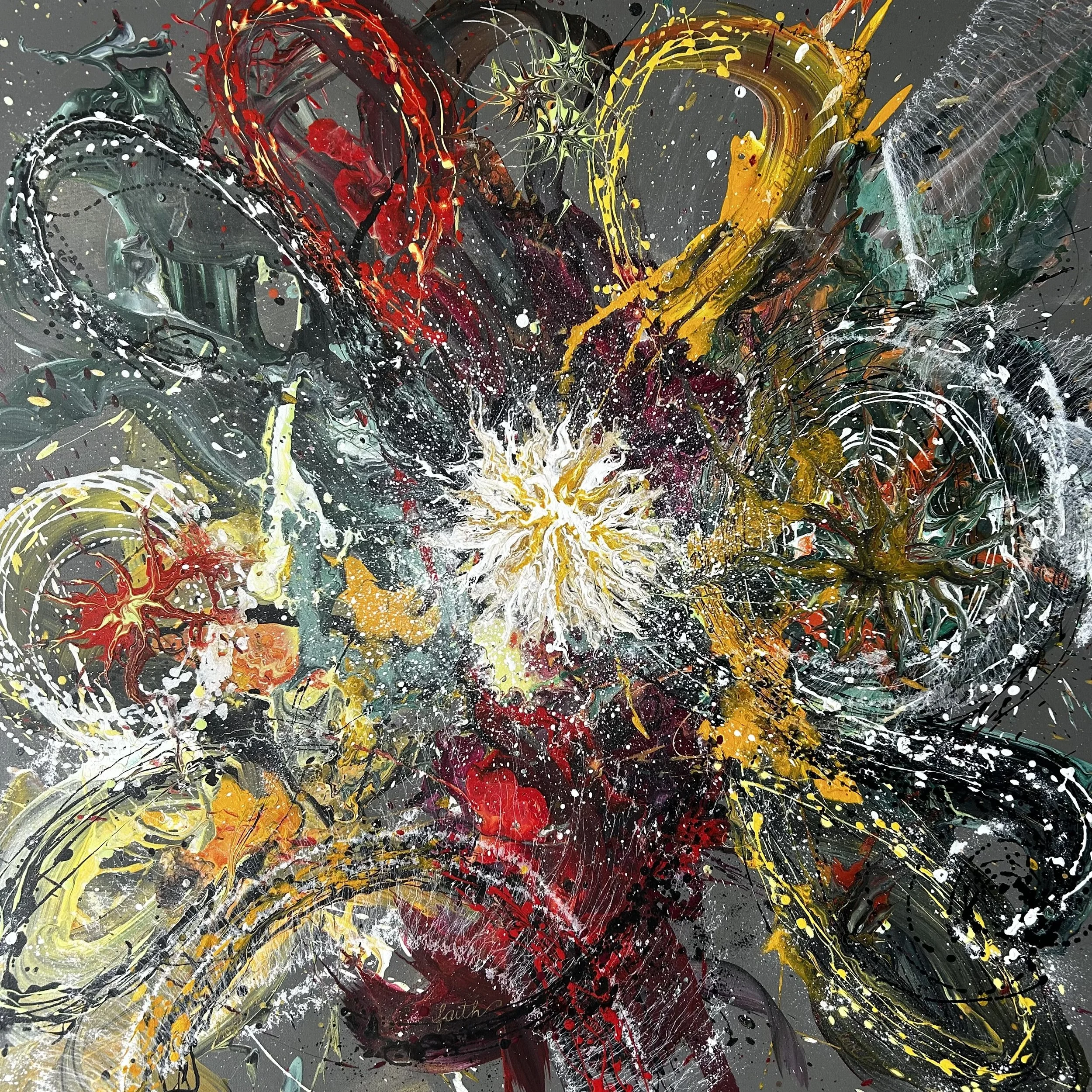 Hidden between the brushstrokes are the words Love. Faith. Hope.