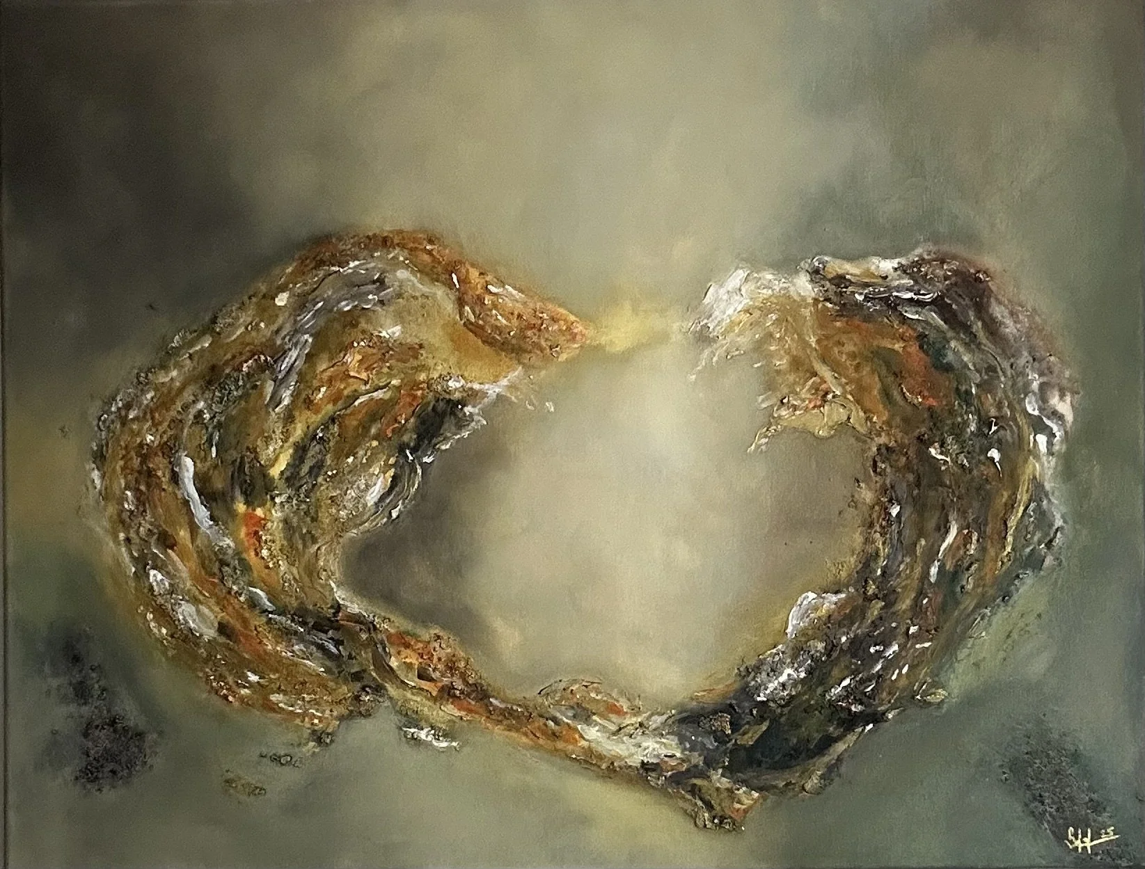 A quiet meeting of two energies. Light at the center symbolizes transformation. Earthy tones create a sense of calm and balance.