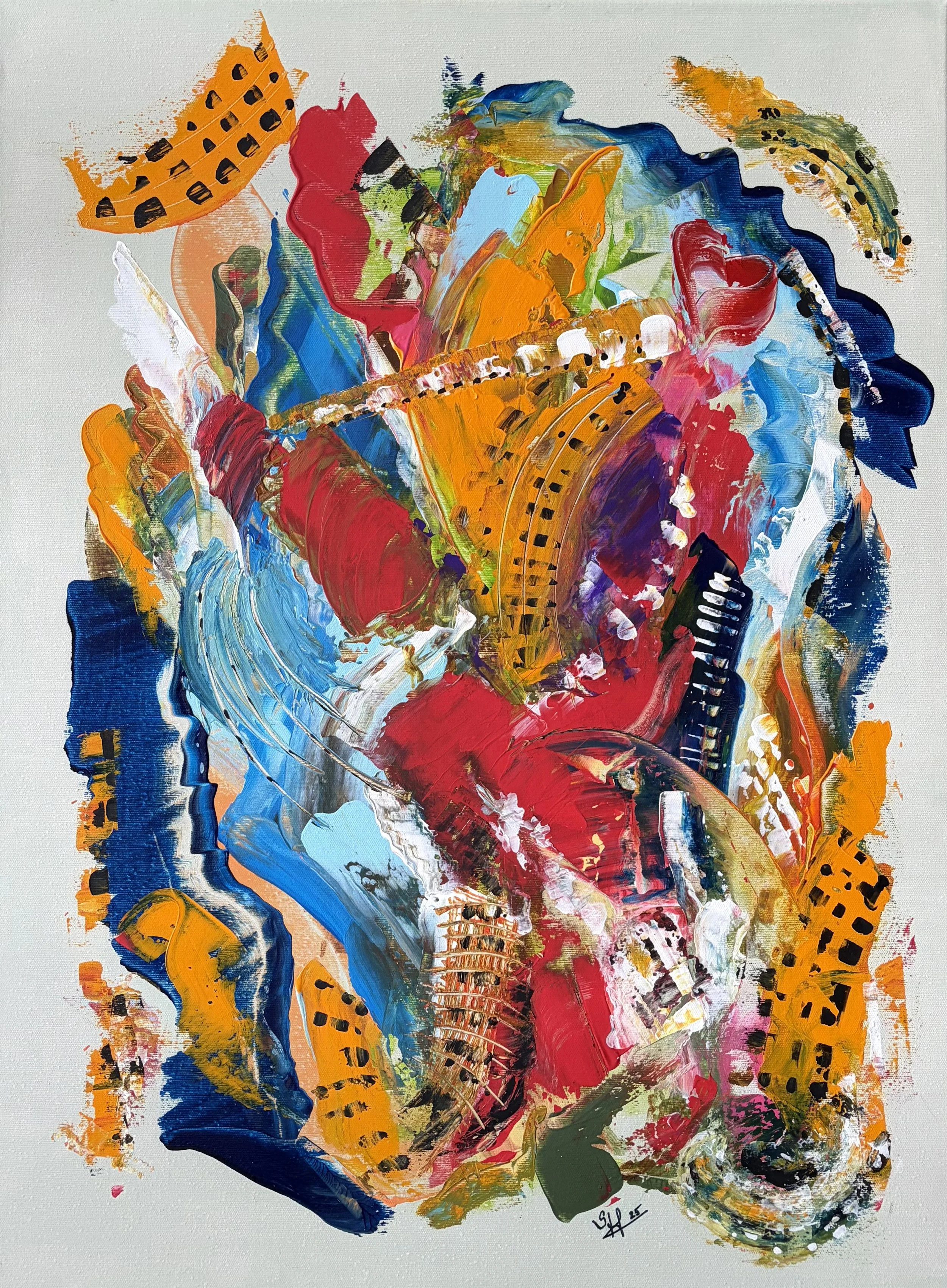 Barevné vrstvy se prolínají jako městské ulice v neustálém proudu života – živé, dynamické a nespoutané.