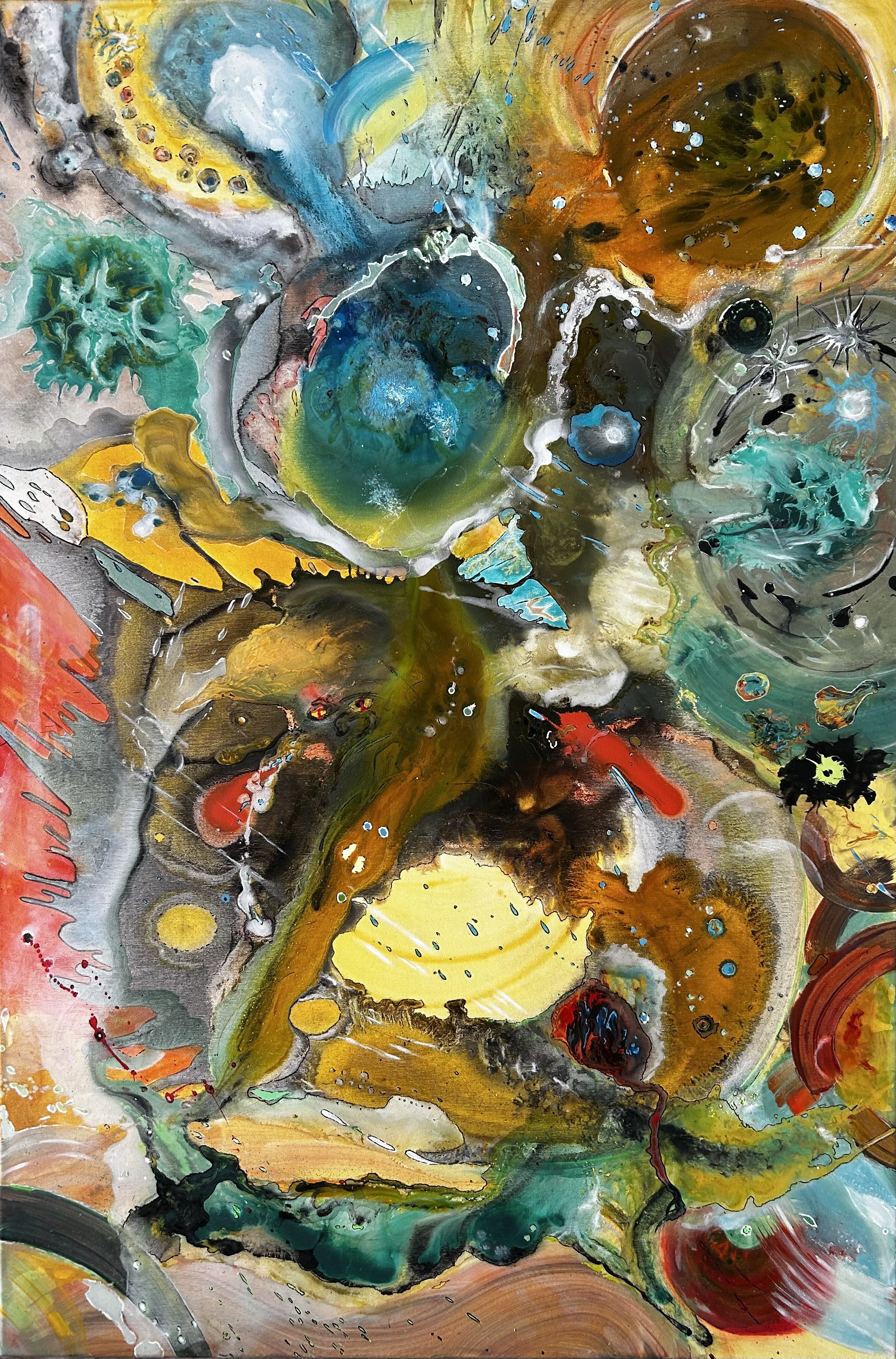 At the center, a form appears that can resemble a cell, a planet, or the origin of life itself.